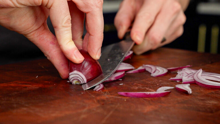 The white balsamic gives a rounder, more complex flavor that’s not as aggressively sharp. And slicing them paper-thin means they work in more applications – they drape over tacos, tuck into sandwiches, and blend into dishes instead of dominating them.