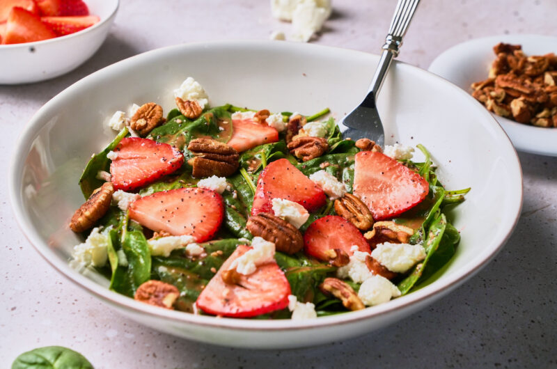 Strawberry Spinach Salads, while delicious, typically comes with some guilt, due to the vast amount of sugar and seed oils in the dressing. So we set out to redeem it, making this a guilt free salad that doesn’t sacrifice on ANYTHING flavor wise.