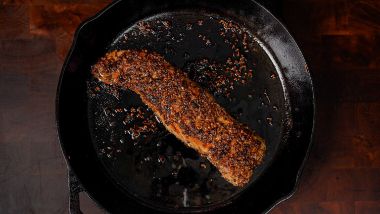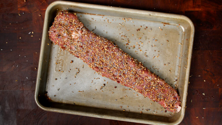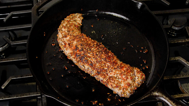 This one borrows a spice blend from the world renown 3 Michelin star restaurant Eleven Madison Park. A fragrant whole-spice blend that gets cracked just enough to bring out the aromatics, pressed into a honey-glazed pork. The lavender isn’t floral or fussy — it rounds out the earthy cumin and coriander and plays beautifully against the numbing qualities of the Szechuan peppercorn. The tenderloin gets cooked perfectly to 142°F so it stays juicy while being cooked all the way through.